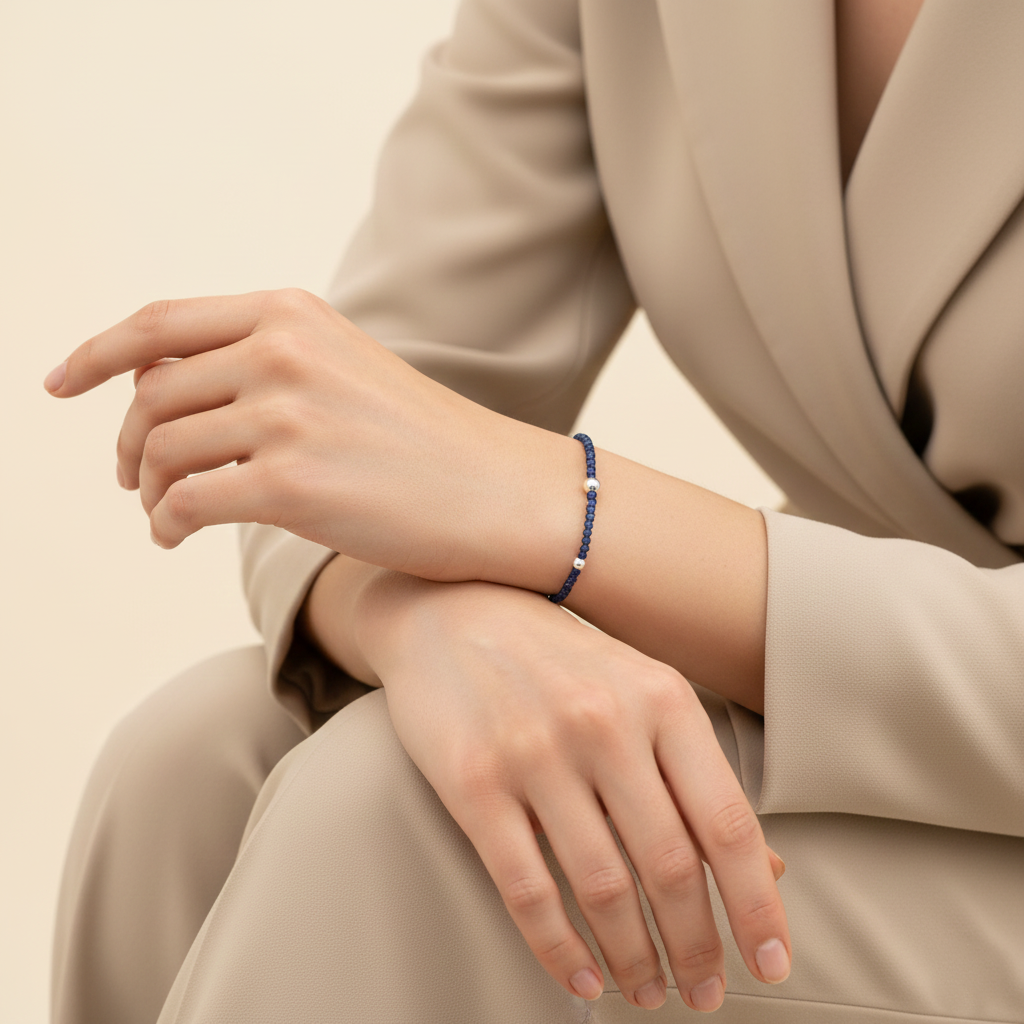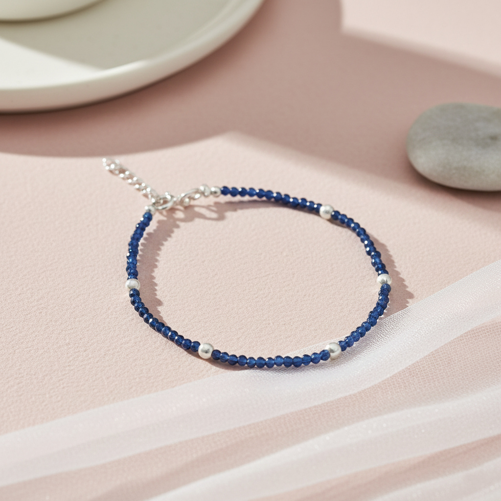 Blue Crystal Silver Bead Bracelet Crafted with precision, this sterling silver bead bracelet features luminous blue crystals that catch light with every movement. The carefully selected gemstones are paired with polished silver beads, creating a refined piece suitable for both everyday wear and special occasions. The flexible design ensures comfortable fit, while the quality craftsmanship guarantees durability. An ideal accessory for those who appreciate understated elegance and timeless jewellery design.