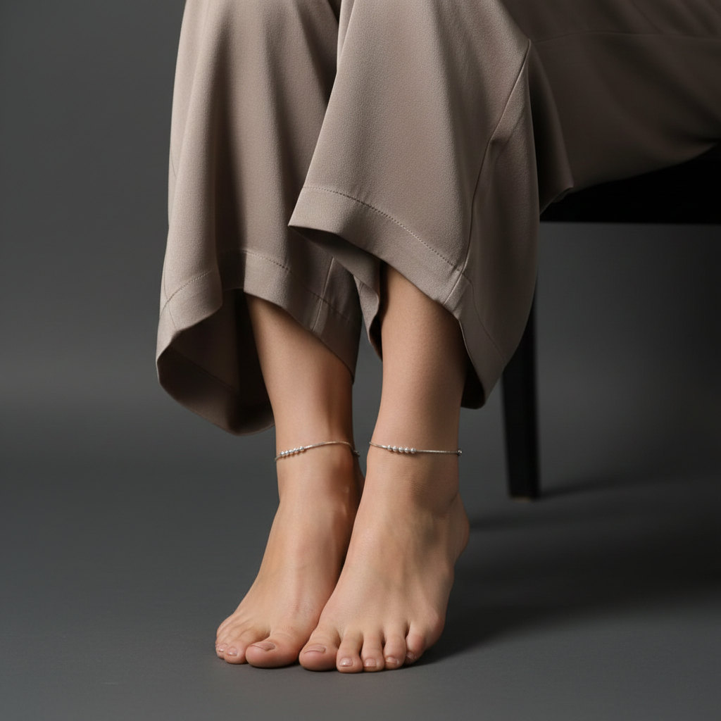 Elevate your ankle jewellery collection with this contemporary payal crafted from pure silver. The bead flow chain design combines traditional Indian aesthetics with modern minimalism, creating a versatile piece that transitions seamlessly from everyday wear to festive occasions. Its lightweight construction ensures all-day comfort without compromising on elegance. The fluid chain movement catches light beautifully, adding subtle sophistication to any ensemble. Perfect for those who appreciate authentic craftsmanship and refined design, this payal embodies the timeless appeal of silver jewellery with a distinctly contemporary edge.