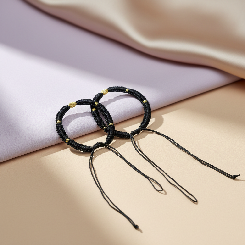 Traditional Silver Dhaga Anklet (Gold Polished Beads) Handcrafted silver dhaga anklet featuring lustrous gold-polished beads strung on traditional silver thread. This timeless piece combines authentic craftsmanship with refined elegance, making it ideal for both everyday wear and festive occasions. The delicate interplay of silver and gold tones adds versatility to your jewellery collection. Perfect for those who appreciate traditional Indian jewellery with contemporary appeal.