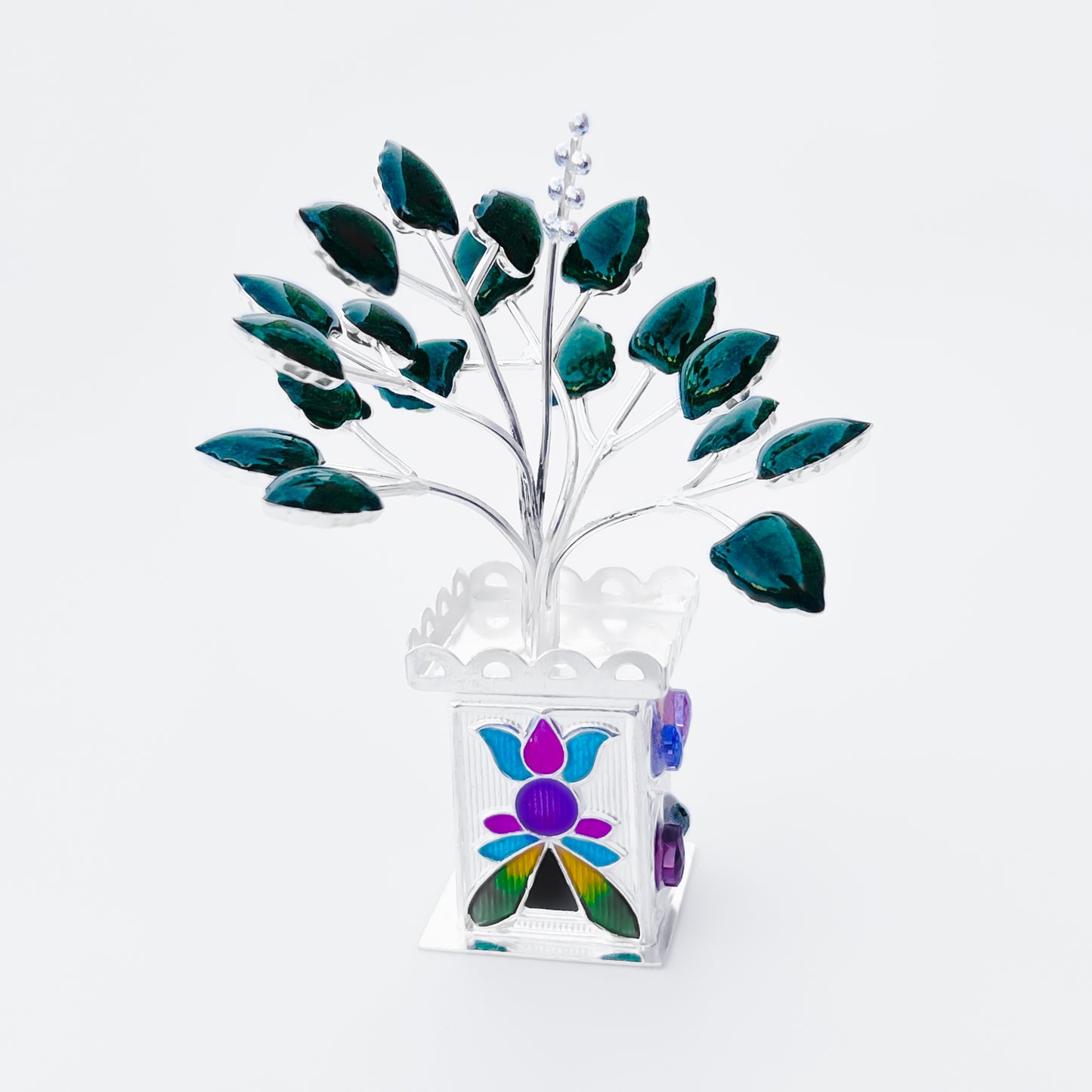 This Beautiful Silver Tulsi Plant is a sacred symbol of purity and devotion. It is handcrafted with intricate details that make it a stunning addition to any home or garden. The Tulsi plant is highly revered in Indian culture for its spiritual and medicinal benefits. Bring peace and positivity into your space with this beautiful and meaningful plant.