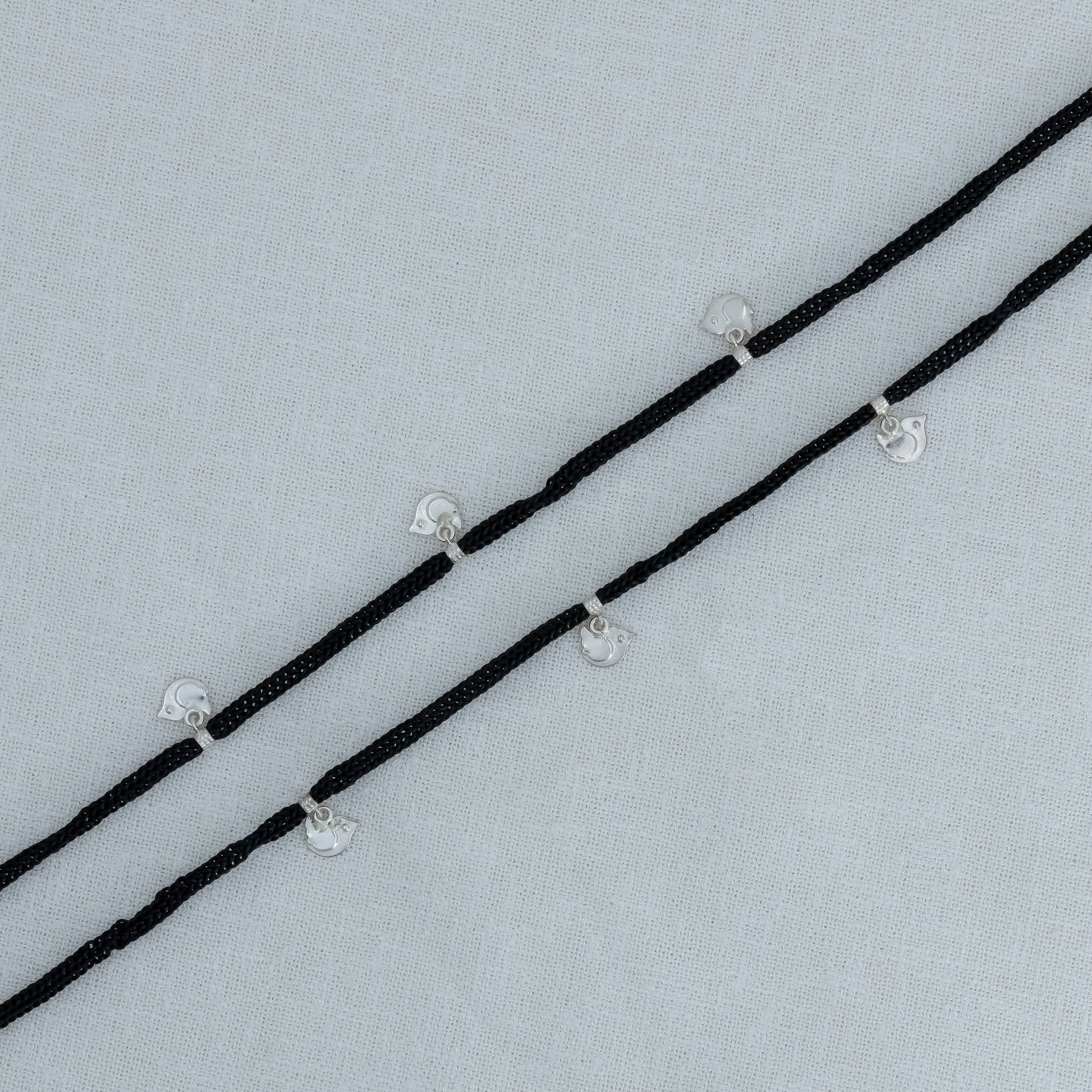 Elegant Silver Charm Thread Anklet with Black Dori & Cute Bird Drop