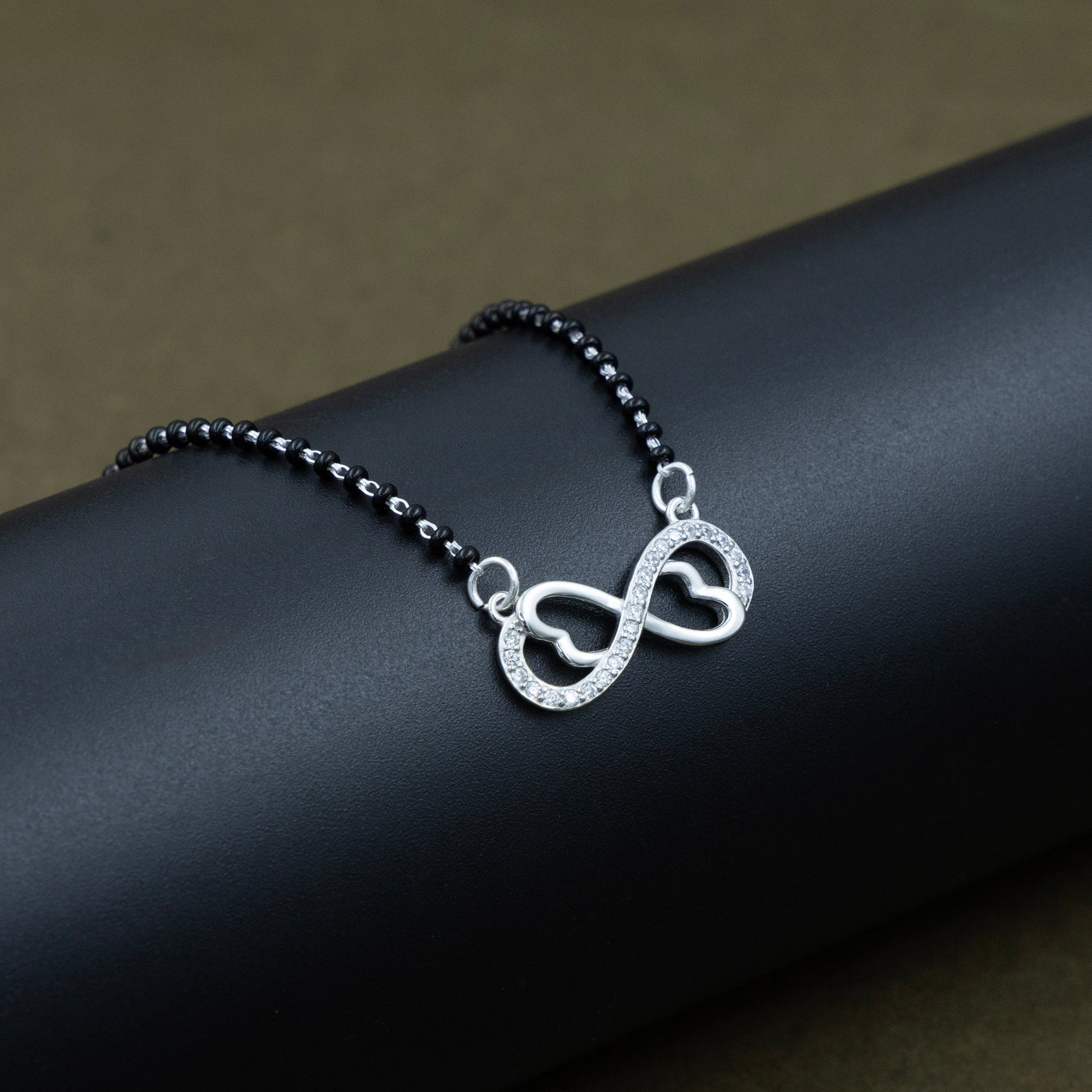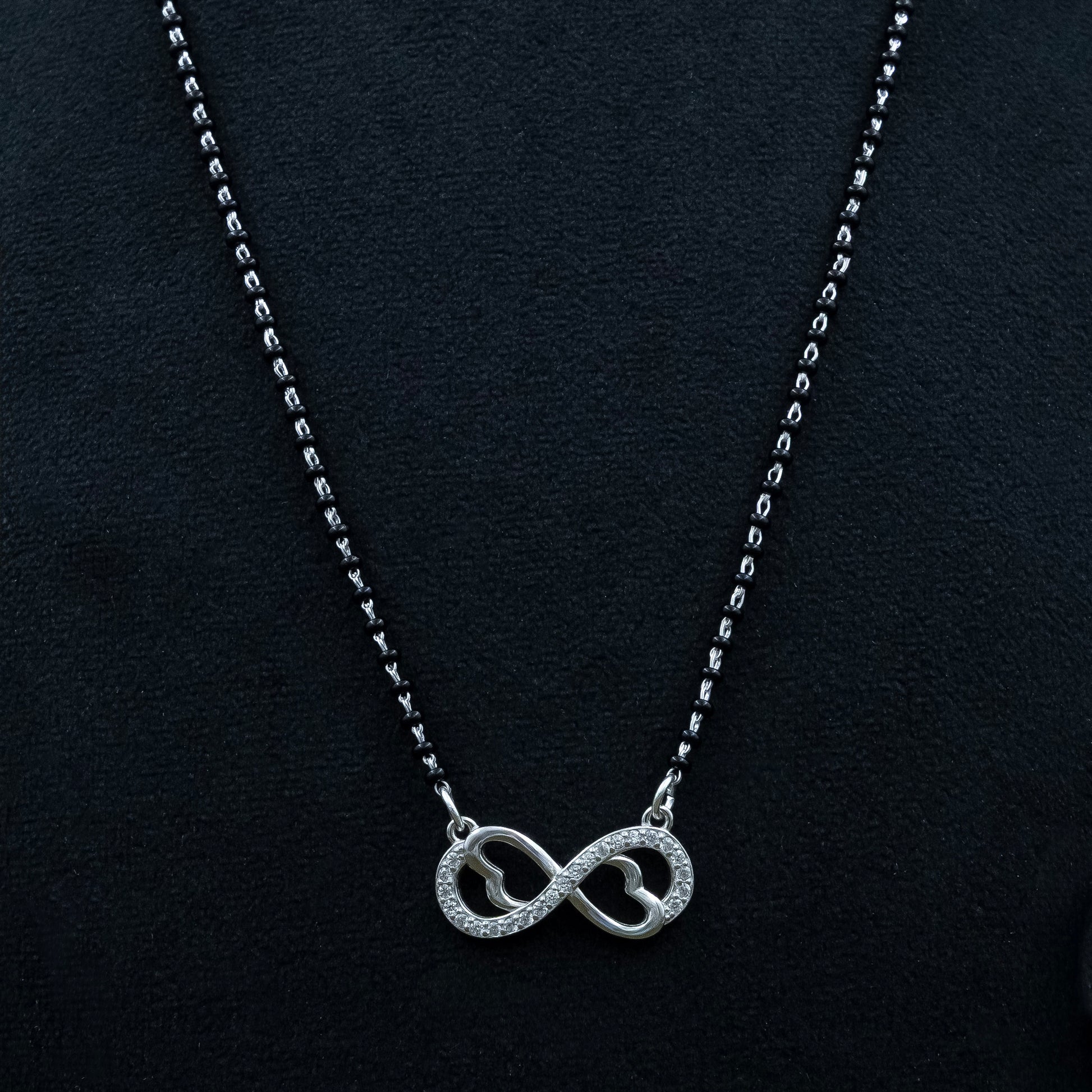 Infinity Love Black Beads Silver Mangalsutra Celebrate eternal love with this exquisite silver mangalsutra, where timeless symbolism meets contemporary design. Crafted in premium silver, the piece features lustrous black beads that create striking contrast against the precious metal, embodying the infinity symbol's promise of boundless devotion. Each bead is carefully selected for depth and uniformity, while the silver work showcases refined artisanal detailing. The mangalsutra's traditional significance is elevated through modern aesthetics, making it an ideal choice for weddings, anniversaries, or as a cherished heirloom. Versatile enough for daily wear yet elegant for special occasions, this piece honours heritage while embracing contemporary style.