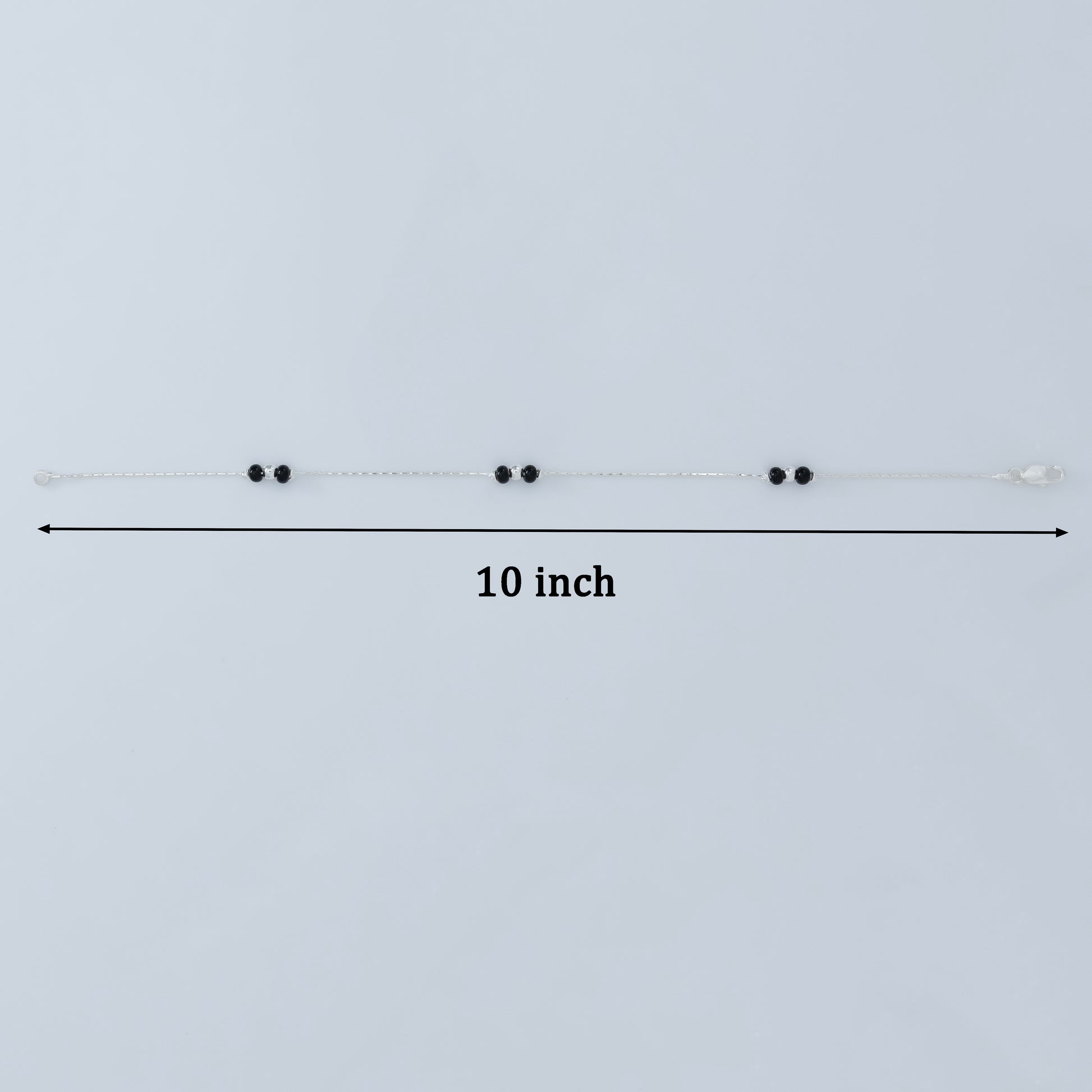 This lightweight black beaded silver anklet combines elegance with comfort, crafted from high-quality silver for durability and shine. The delicate black beads add a subtle contrast, enhancing its sophisticated appeal. Perfect for everyday wear or special occasions, it offers a refined touch that complements diverse styles while ensuring ease of movement.
