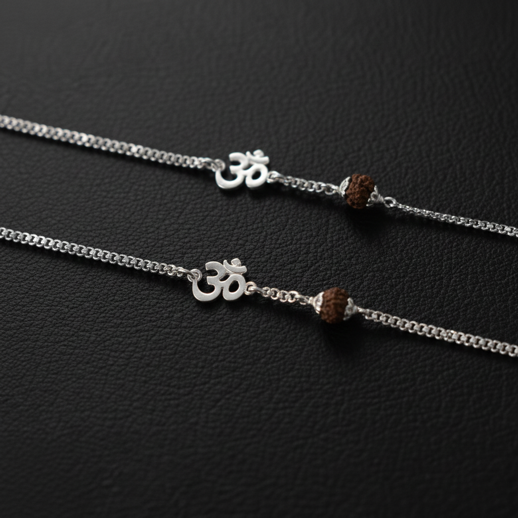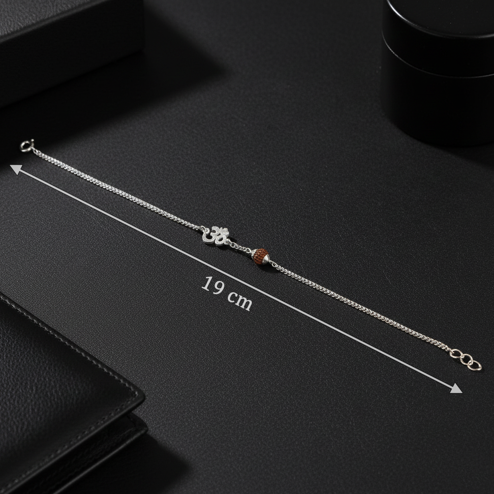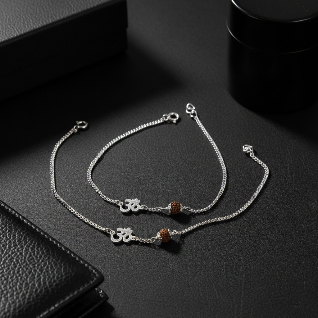 (2 Pcs ₹1999) Men’s Silver Rudraksha Bracelet Om Symbol Adjustable