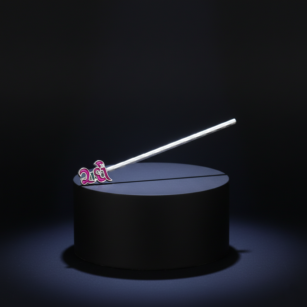 Celebrate divine love with this exquisite Pink Enamel "Radha" Silver Flute pendant. Crafted in sterling silver with vibrant pink enamel detailing, this devotional piece honours the eternal bond between Radha and Krishna. The delicate flute design symbolizes Krishna's enchanting music and spiritual grace, making it a meaningful addition to any jewellery collection. Perfect for devotees seeking to express their faith through wearable art, this pendant combines traditional craftsmanship with contemporary elegance. An ideal gift for spiritual occasions or personal devotion.