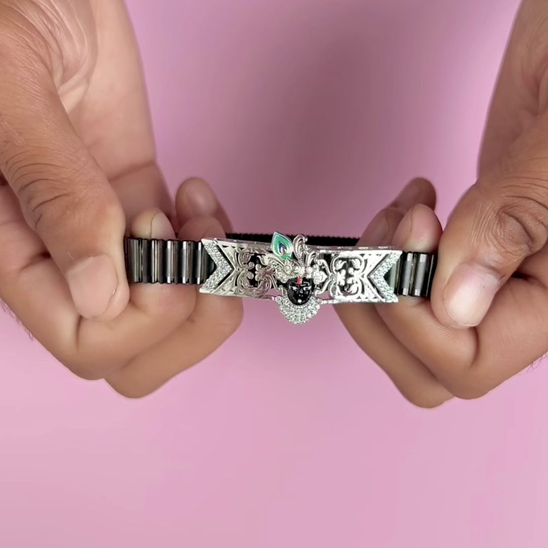 This Pure Silver Krishna Design Bracelet combines traditional artistry with fine craftsmanship. Made from high-quality pure silver, it offers durability and a timeless finish. The intricately detailed Krishna motif not only reflects cultural significance but also serves as a meaningful symbol, making this bracelet a distinguished accessory for daily wear or special occasions. Its elegant design ensures comfort without compromising style. Ideal for those seeking a unique piece that balances spiritual heritage with refined aesthetics.