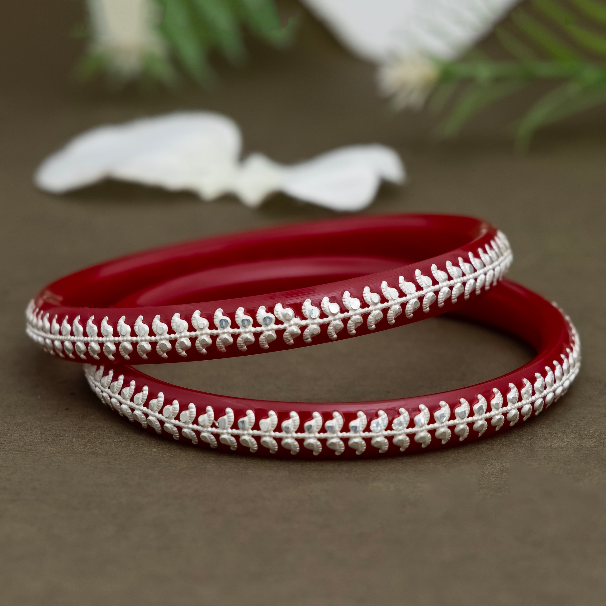 These red bangles feature a striking pure silver border that enhances their vibrant colour and elegance. Crafted with precision, they offer a perfect blend of traditional charm and contemporary style. Ideal for both festive occasions and everyday wear, these bangles provide durability while adding a refined touch to your ensemble.