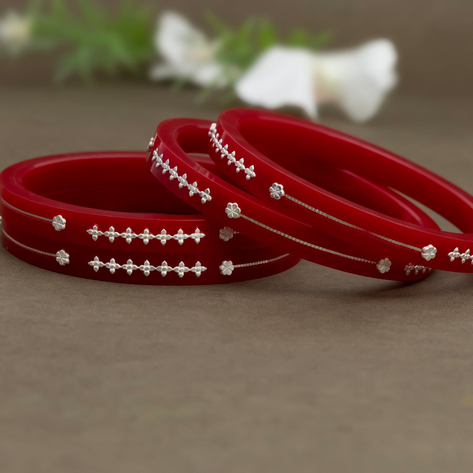These Red Glam Bangles with Silver Touch elegantly combine vibrant red hues with subtle silver accents, making them perfect for adding a refined yet striking element to your ensemble. Expertly crafted to balance bold color with delicate metallic detail, they offer versatility for both festive occasions and everyday wear. Their lightweight design ensures comfortable all-day use without compromising style.