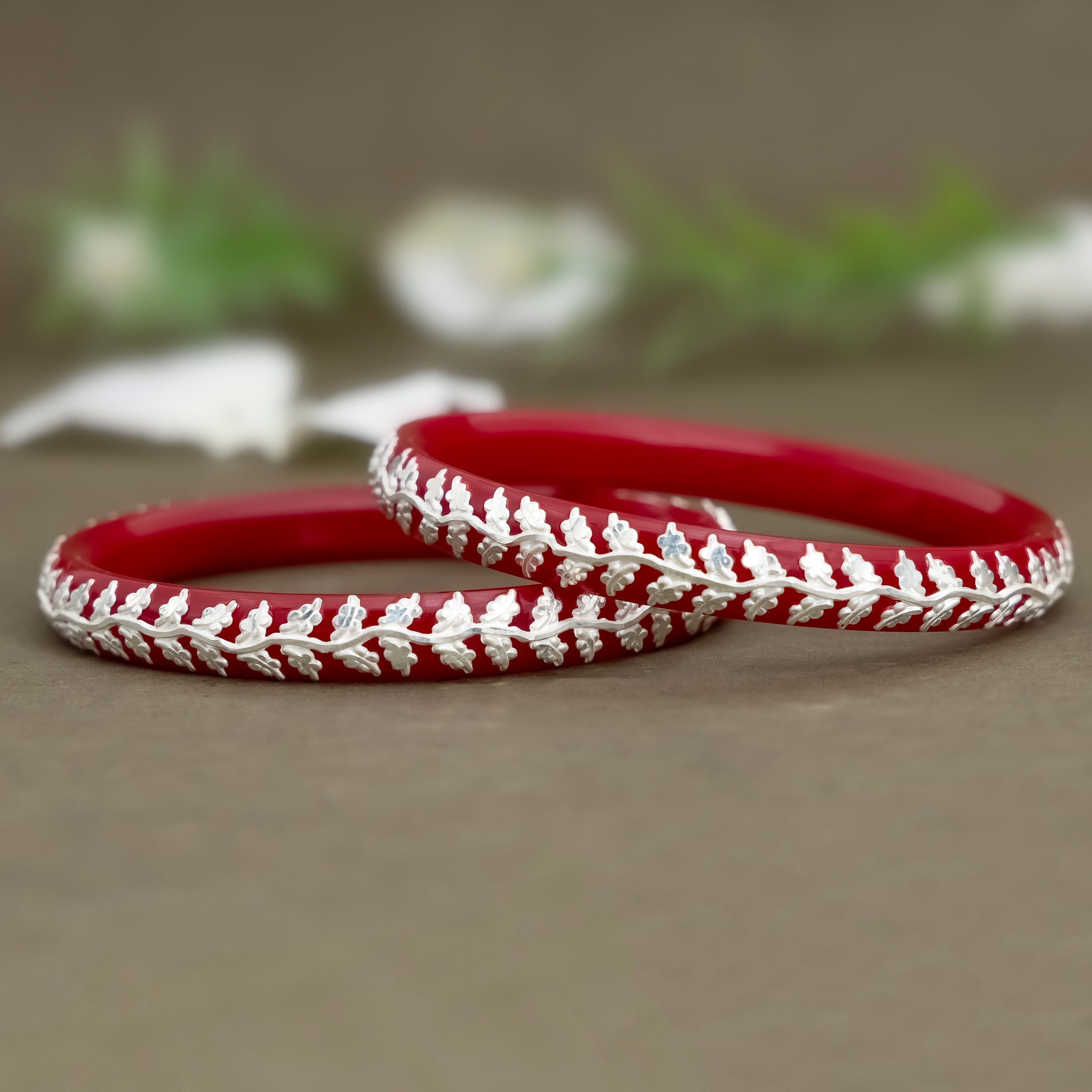 These red glass bangles feature an exquisite pure silver leaf design, combining vibrant color with elegant craftsmanship. Crafted to enhance traditional and contemporary looks alike, they offer both durability and a striking aesthetic. Ideal for special occasions or daily wear, these bangles provide a timeless accessory that complements diverse styles with expert finesse.
