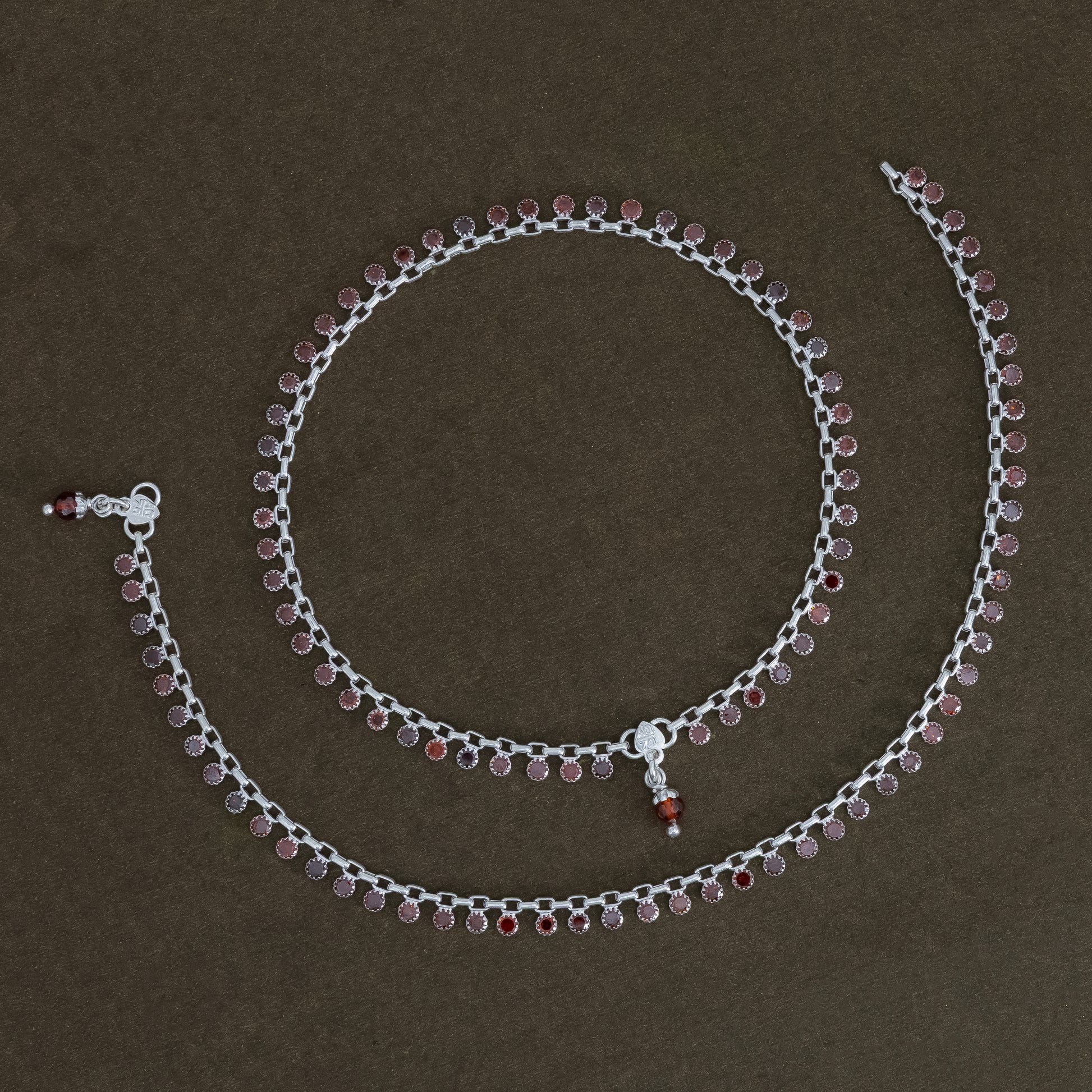 Red Stone Studded Silver Payal – Modern Touch with Traditional Elegance Elevate your ethnic ensemble with this exquisitely crafted silver payal, where contemporary design meets timeless tradition. Adorned with vibrant red stones that catch light with every step, this piece seamlessly bridges classic Indian jewellery heritage with modern sensibilities. The sterling silver construction ensures durability and a lustrous finish, while the thoughtfully placed gemstones add sophistication without overwhelming the design. Perfect for festivals, weddings, or everyday wear, this payal strikes the ideal balance between statement-making elegance and wearable comfort. A versatile addition to any jewellery collection that honours tradition while embracing contemporary style.