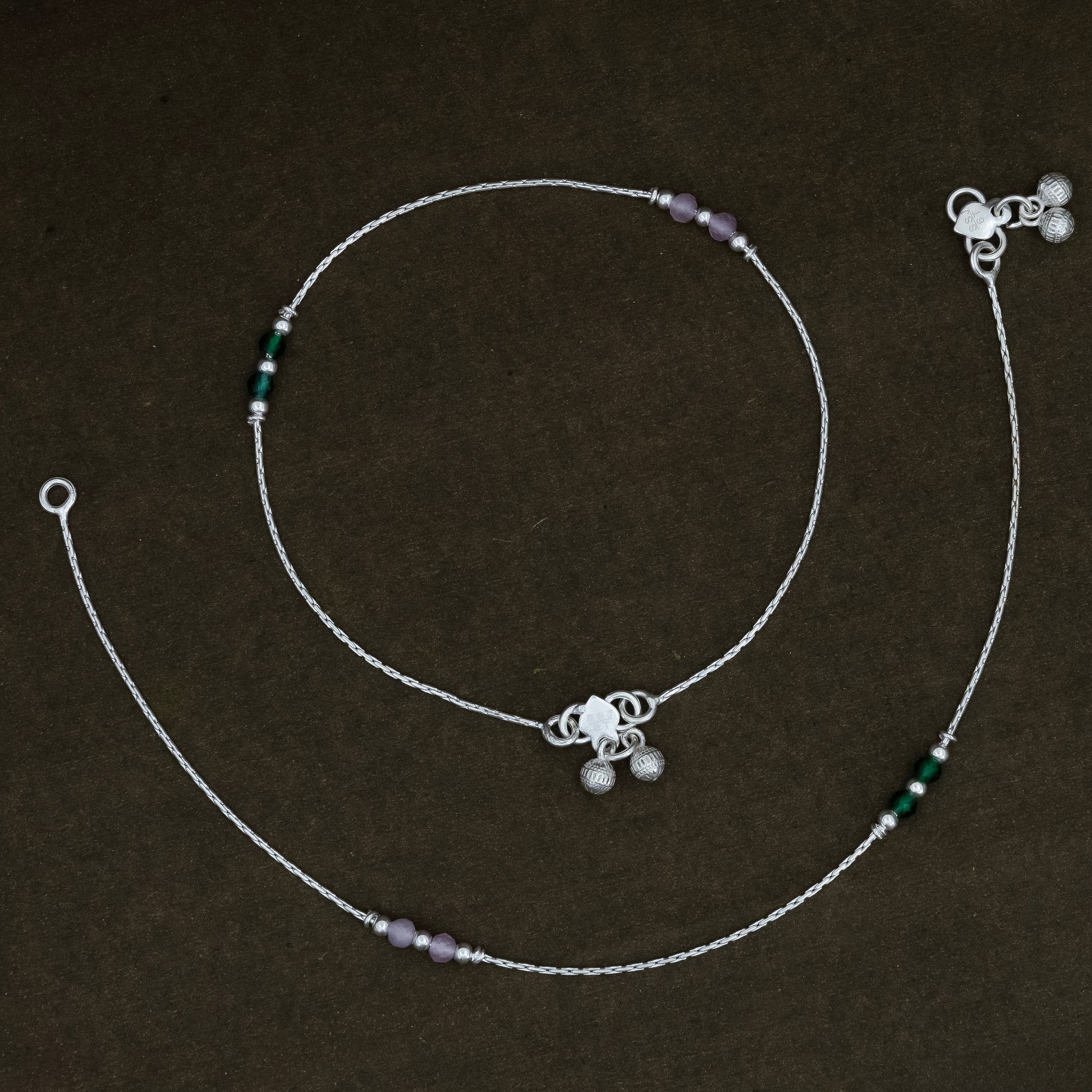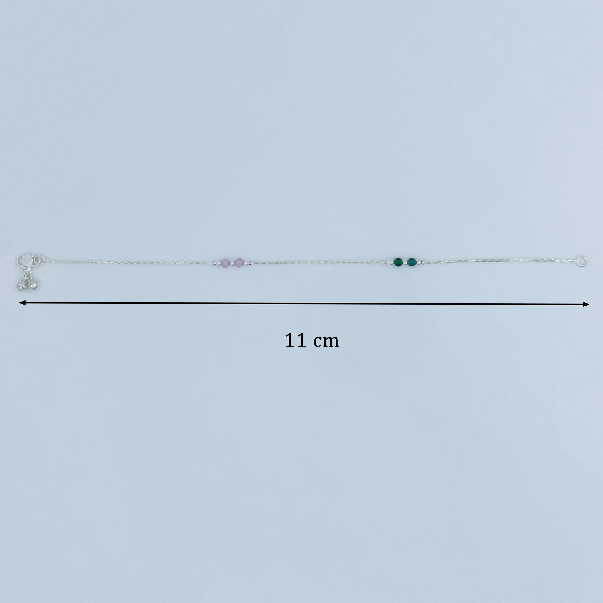 Crafted with finesse, this silver anklet features delicate green & pink beads that add a subtle splash of colour to your ensemble. Its elegant design ensures a refined look suitable for both casual and formal occasions, while the quality silver provides durability and a timeless shine. Perfect for those who appreciate understated sophistication.
