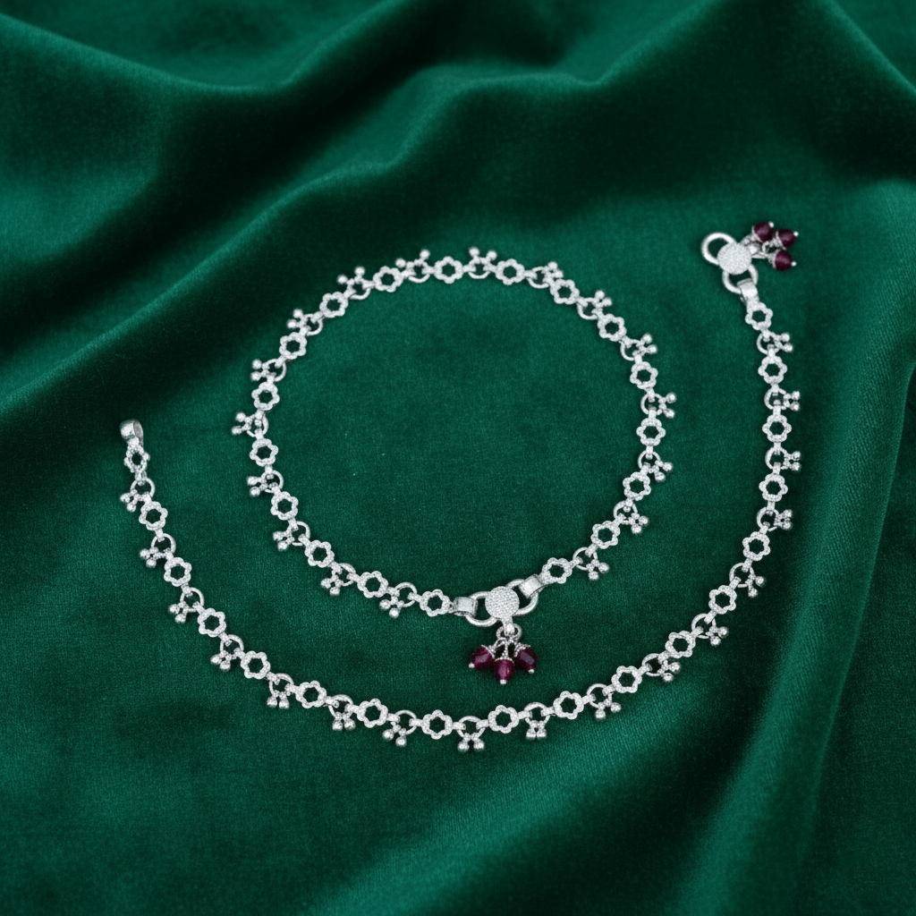 Silver Flower Design Payal Pair Elegant & Lightweight Crafted in sterling silver, this payal pair features delicate floral motifs that blend traditional artistry with contemporary elegance. The lightweight construction ensures all-day comfort without compromising on visual impact. Each piece showcases intricate detailing, making it an ideal choice for both festive occasions and everyday wear. The polished finish enhances the natural lustre of silver, while the secure closure guarantees durability. Perfect for those who appreciate refined jewellery that honours heritage craftsmanship.