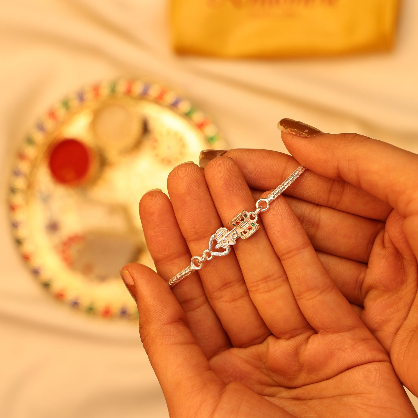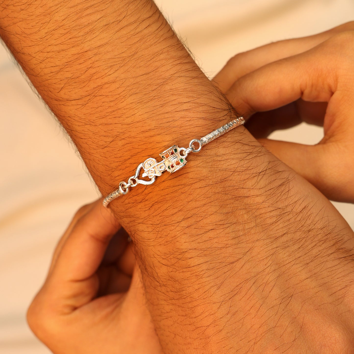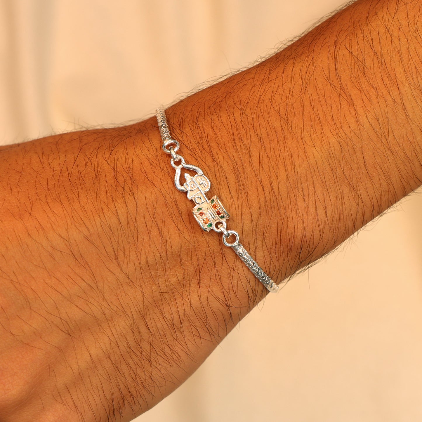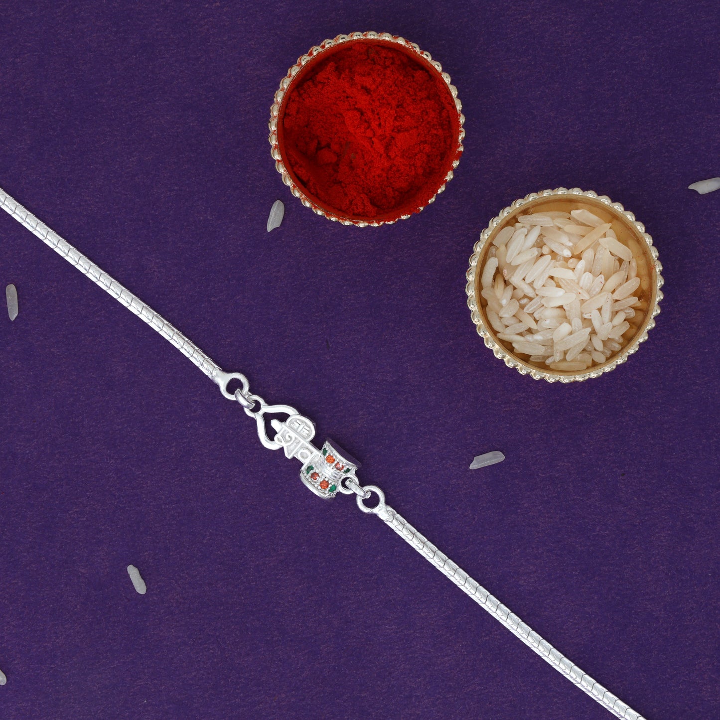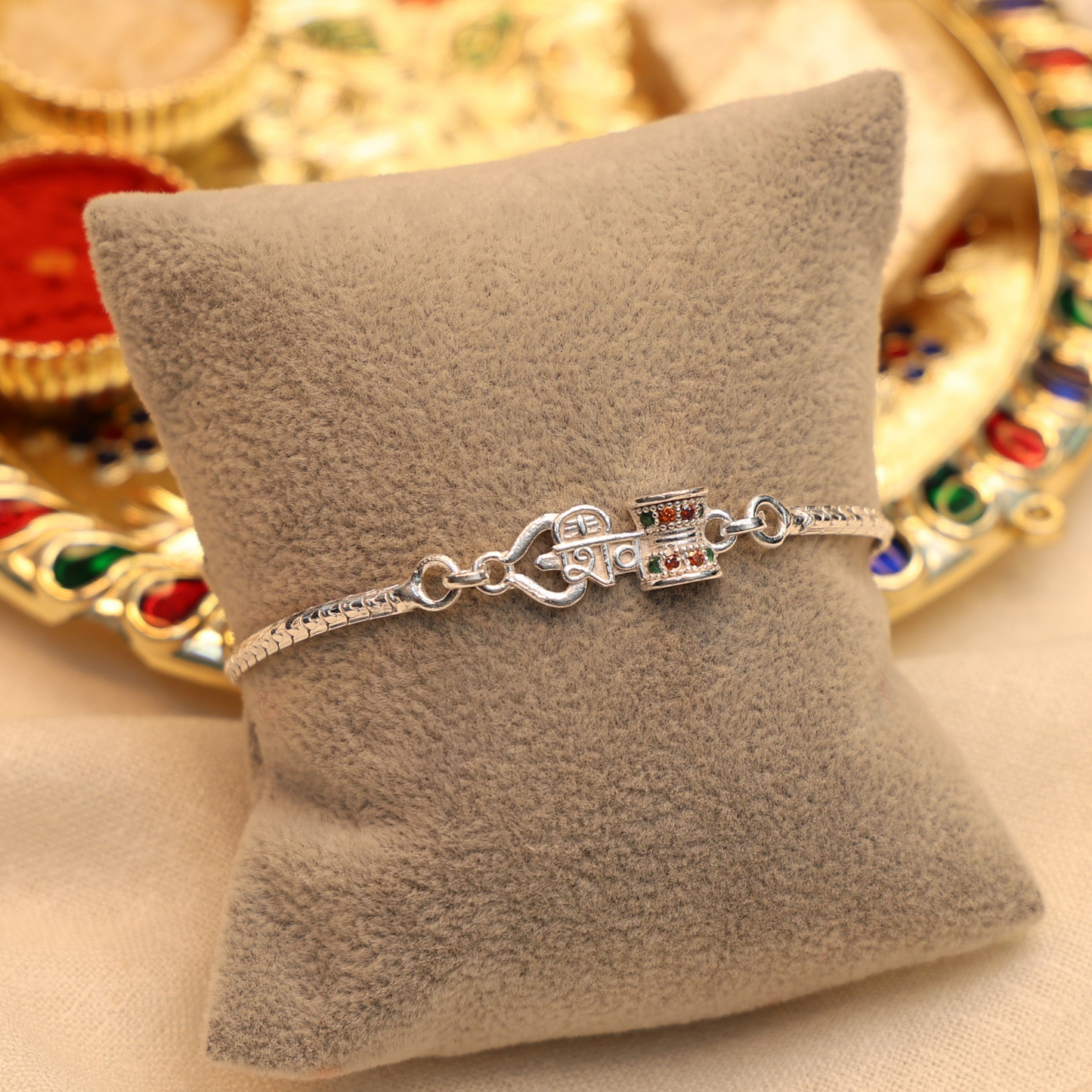 Celebrate the sacred bond of Raksha Bandhan with the Trishul Damru Silver Bracelet Rakhi. Expertly crafted in sterling silver, this bracelet features intricate designs of the Trishul and Damru, symbolizing divine protection and harmony. Its elegant craftsmanship ensures durability and a refined look, making it a meaningful and lasting gift for your brother. Perfect for those who appreciate traditional symbolism combined with contemporary style.